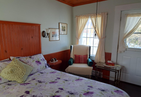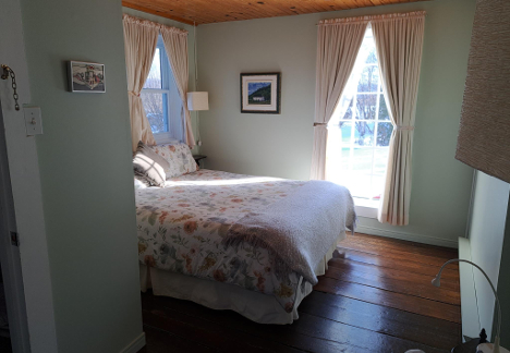 L'ancienne chambre des maîtres avec vue vers l'est avec grand lit queen, coin de lecture, garde-robe et salle de bain privée.