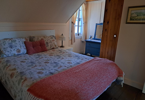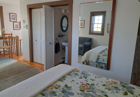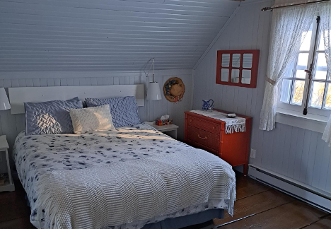 Notre chambre côté sud, très ensoleillée, avec grand lit queen, coin de lecture, garde-robe et salle de bain privée.